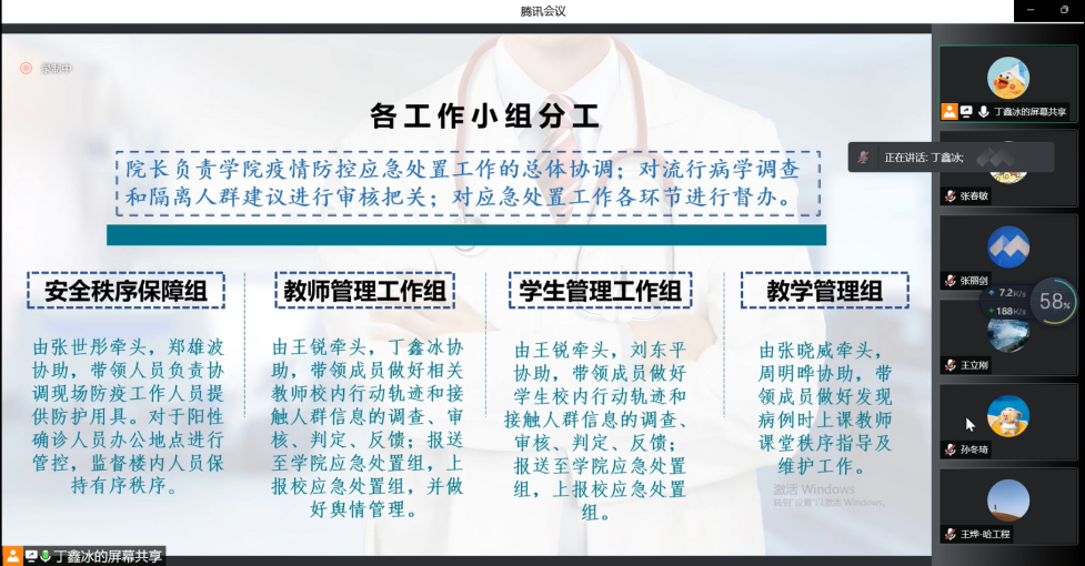 院长助理兼综合办公室主任丁鑫冰结合学校近期疫情防控工作要求,对学院教职工进行疫情防控应急处置培训,重点模拟了如学院逸夫馆出现病例或一密,学院4个应急工作小组和逸夫馆师生如何开展应急处置。