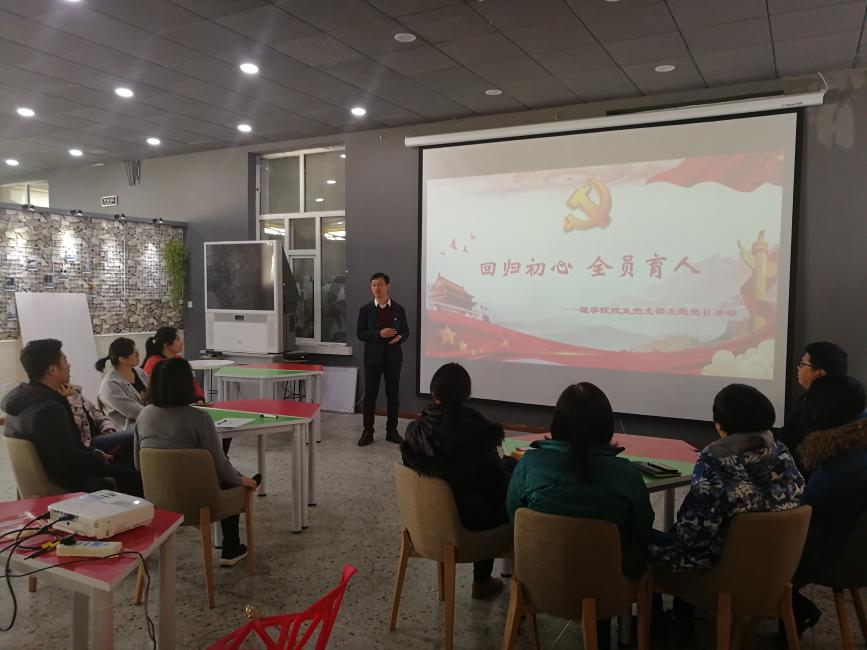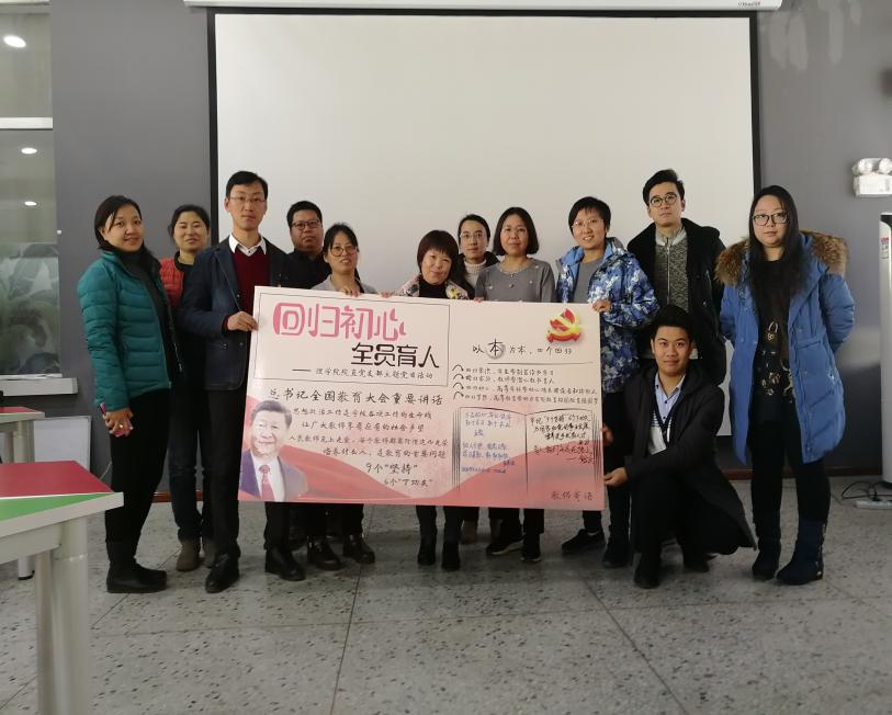 日前,为宣传贯彻全国教育大会精神,理学院院直党支部开展了以“回归初心,全员育人”为主题的党日活动,党支部书记董云吉主持活动。支部党员首先观看了习近平总书记在全国教育大会上的重要讲话视频,董云吉对会议精神做了介绍,对“9个坚持”和“6个下功夫”做了强调,对《教育部关于加快建设高水平本科教育全面提高人才培养能力的意见》(新高教40条)做了简要解读,举例说明了学校党委对于“三全育人”、“课程思政”的高度重视,指出院直党支部的工作需进一步加强信息共享和协同创新,更好地服务于人才培养工作。此后,党员结合本职工作对如何落实全国教育大会精神做了交流,并在宣传展板上寄语明志。