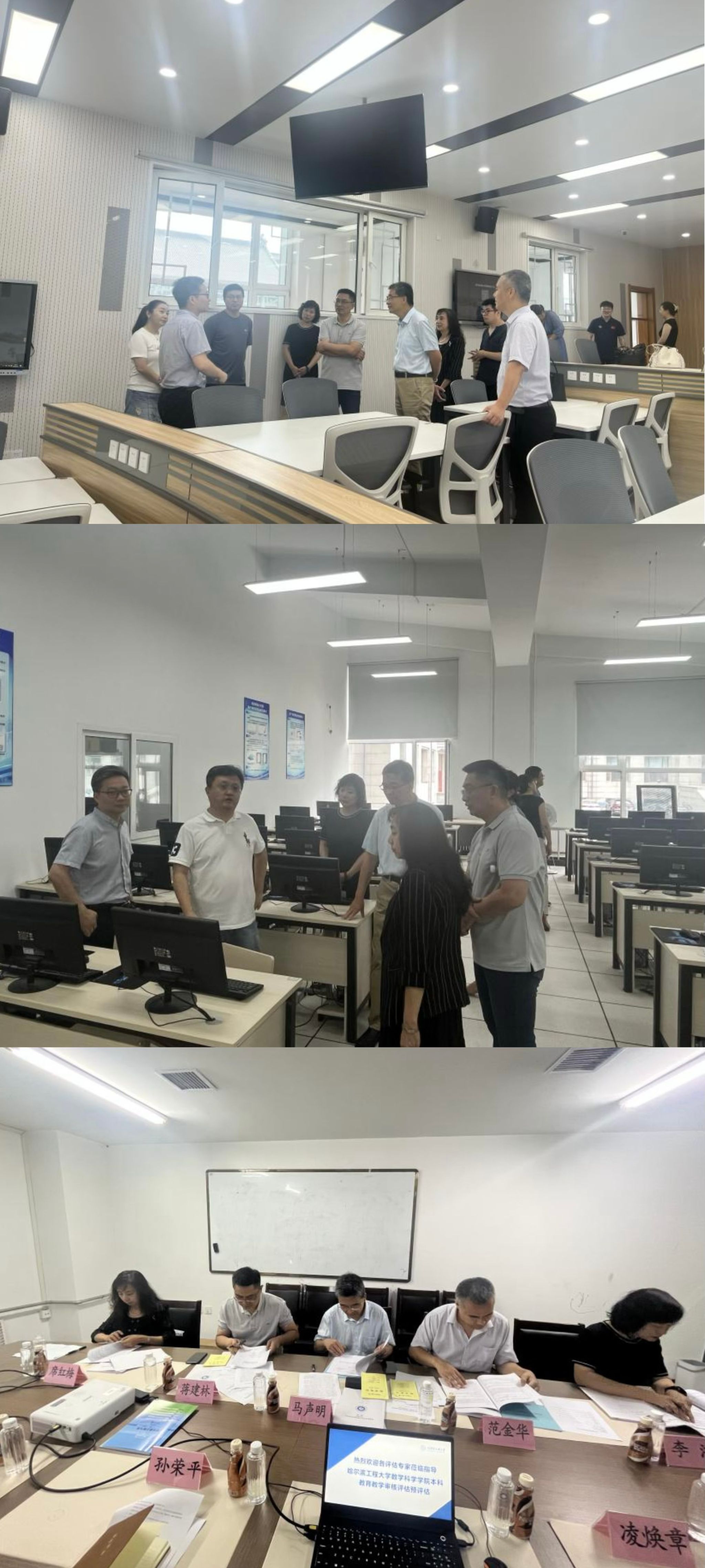 随后,预评估专家组在学院领导的陪同下,参观了学校多媒体教室、学院数学建模实验室以及学院公共课线上阅卷设备,对学校、学院在硬件建设方面的投入给予了高度评价。参观过后,预评估专家组就线上评估存疑问题再次调取了部分教学材料。