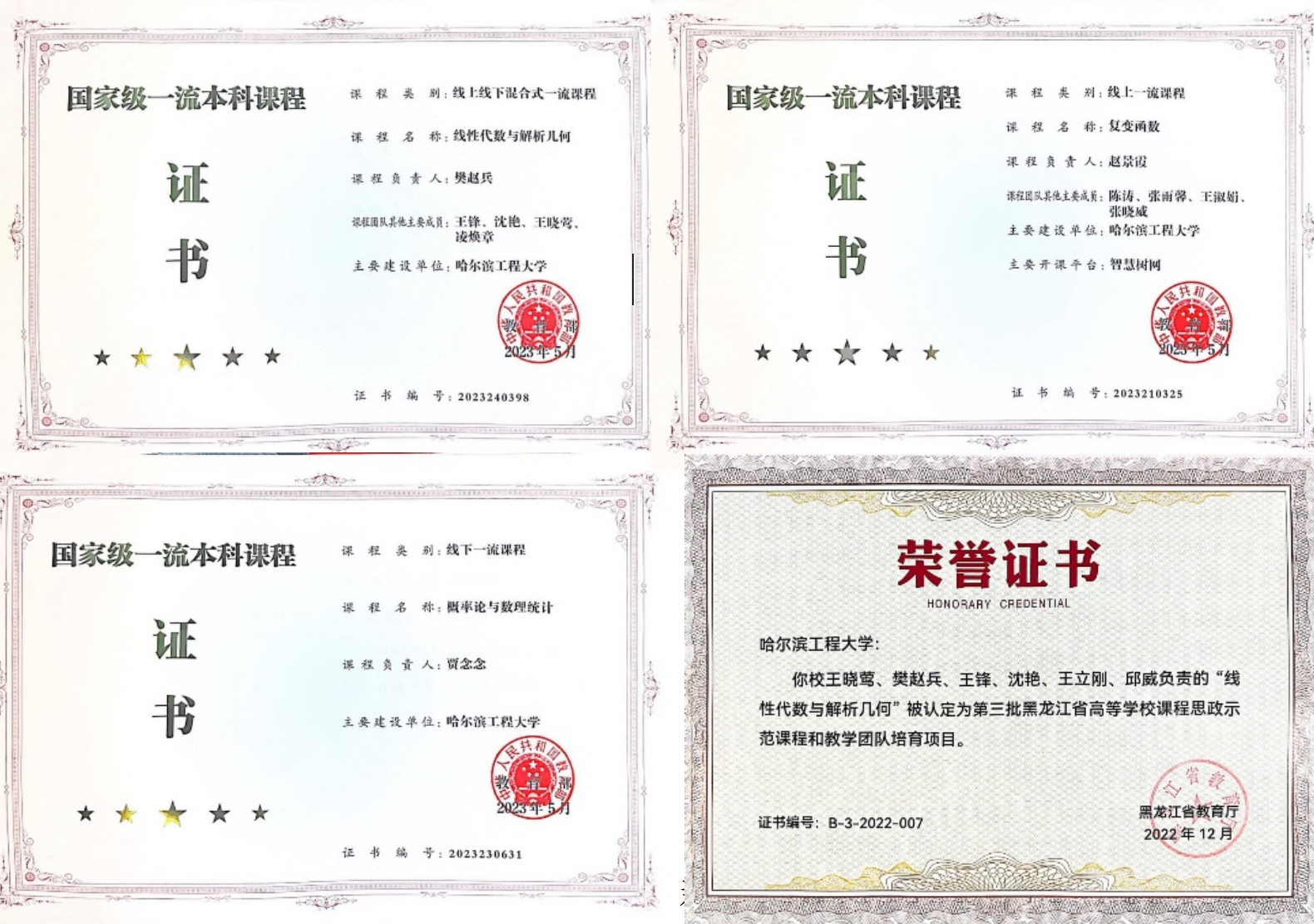 概率论与数理统计、线性代数与解析几何、复变函数三门数学公共课获国家一流本科课程,线性代数与解析几何获黑龙江省课程思政示范课程。