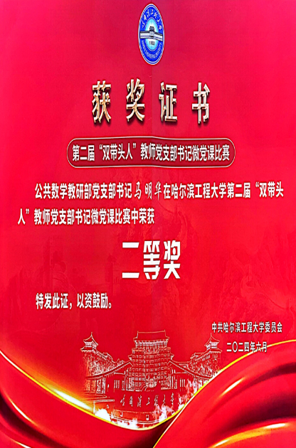 公共数学教研部党支部获得了黑龙江省高校党建工作“样板党支部”培育项目、省师德先进集体等荣誉称号,入选校首届“样板党支部”、“双带头人”书记工作室重点建设项目,获评校先进基层党组织。党支部成员将“数学霸王课”精神根植于心,践之于行,在课程建设等方面起到了引领示范作用,支部成员获黑龙江省课程思政教学名师、省教学名师、省师德师风先进个人,“龙江最美高校辅导员”、国家课程教学创新大赛二等奖等各项荣誉称号10余人次。
