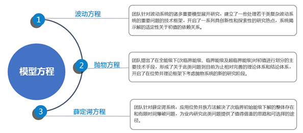 团队近二十年来致力于利用位势井理论研究非线性偏微分方程的解关于初值的依赖问题,并针对偏微分方程中的三大基本模型方程(波方程,热方程和薛定谔方程)的适定性理论,将碎片化研究提升到同一框架下的系统化研究,开创了全能级系统化研究初值与解的适定性关系的新范式。