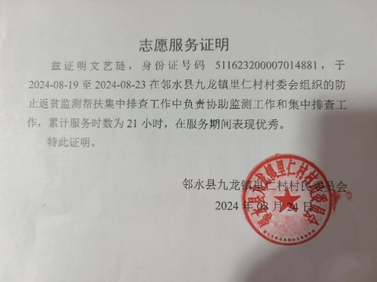 学生文艺琏累计校外参加志愿活动21学时,以上情况公示3天。公示期至9月29日12点之前,如对学生文艺琏在校外参加实践活动情况有异议,请在公示期向辅导员李晋如反映。