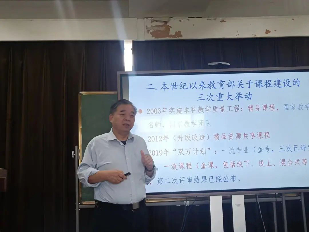 刘三阳以《试谈课程建设与课堂教学》为题,首先讲述了学科、专业、课程之间的关系和课程建设涉及因素,介绍了本世纪以来教育部在课程建设方面的三次重大举措。